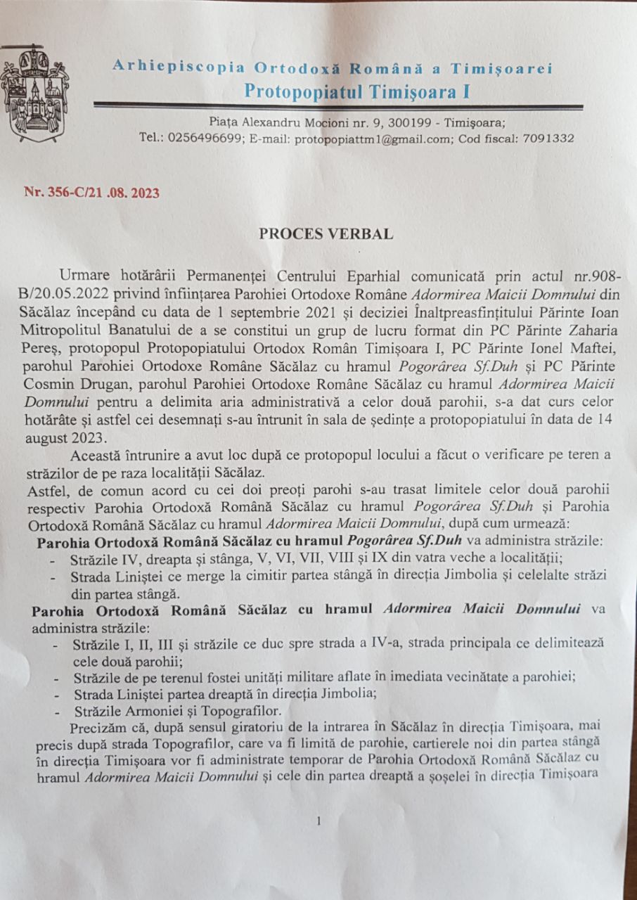 Mai jos puteți studia decizia delimitării administrative teritoriale, arondate parohiilor ortodoxe din comuna Săcălaz (Pogorârea Sfântului Duh și Adormirea Maicii Domnului). Această decizie se pune în aplicare începând cu data 27 August 2023.